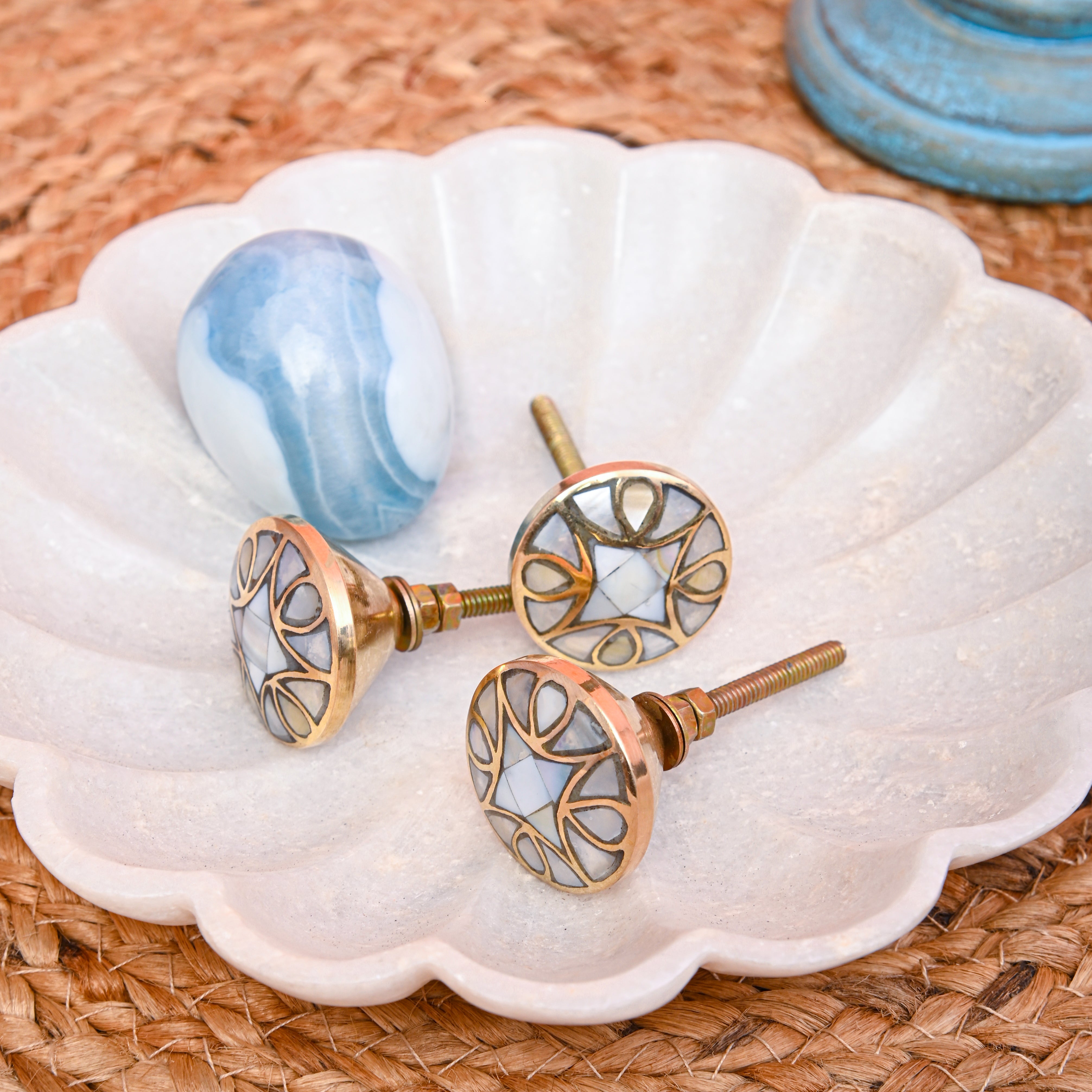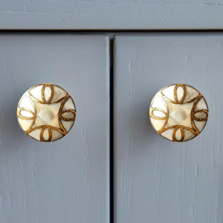 These are beautiful handcrafted set of 6 Pieces MOP Gold Brass Knob. These are of Great Quality Hand made cabinet Pulls makes your Kitchen , Home Office very unique. We make our Knobs using high class raw material than other Sellers . Our quality controllers are very strict in quality control of each product. Look wise These knobs are very pretty. These Knobs always supplied with Standard Size Hardware and plastic washers .