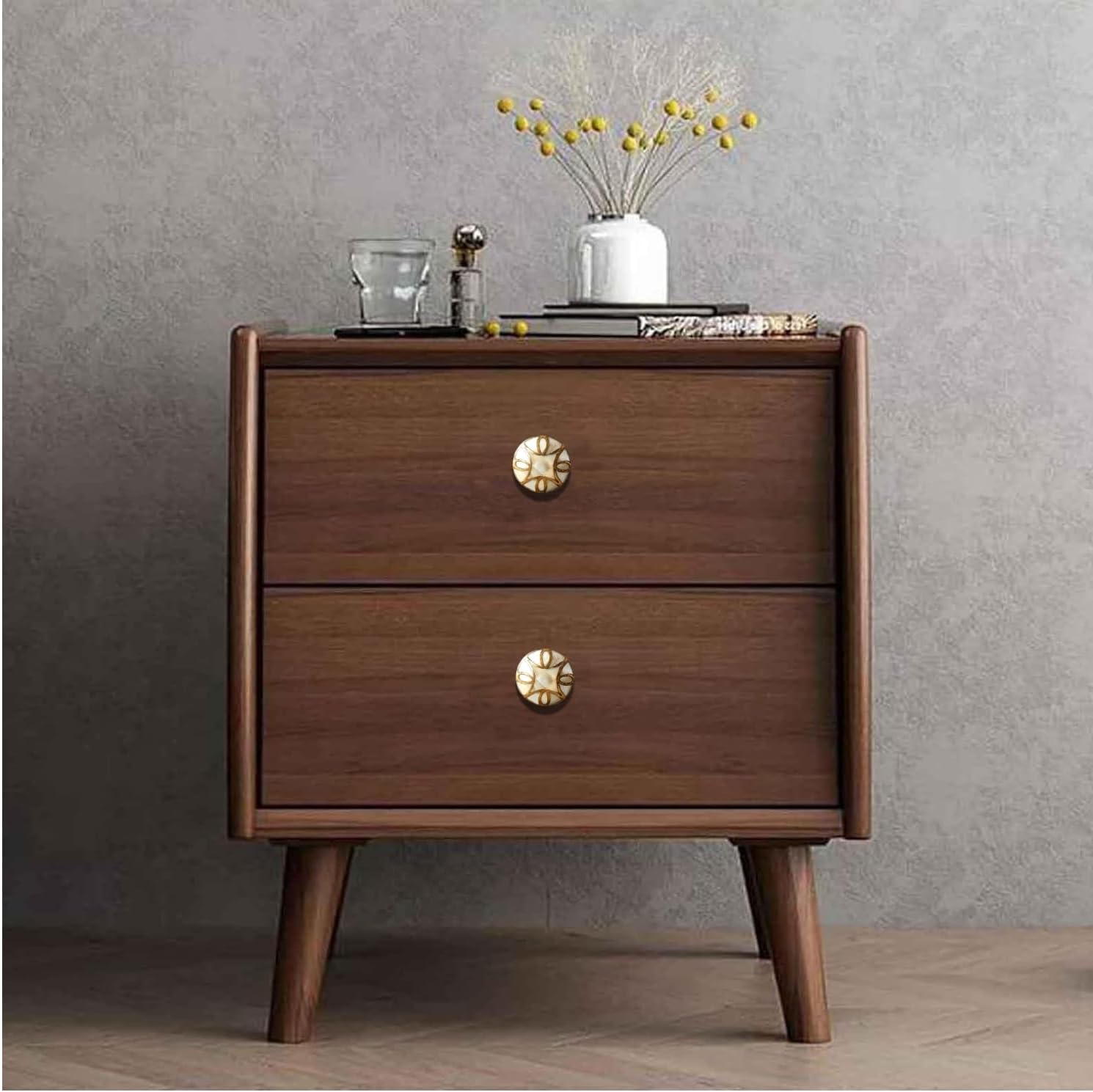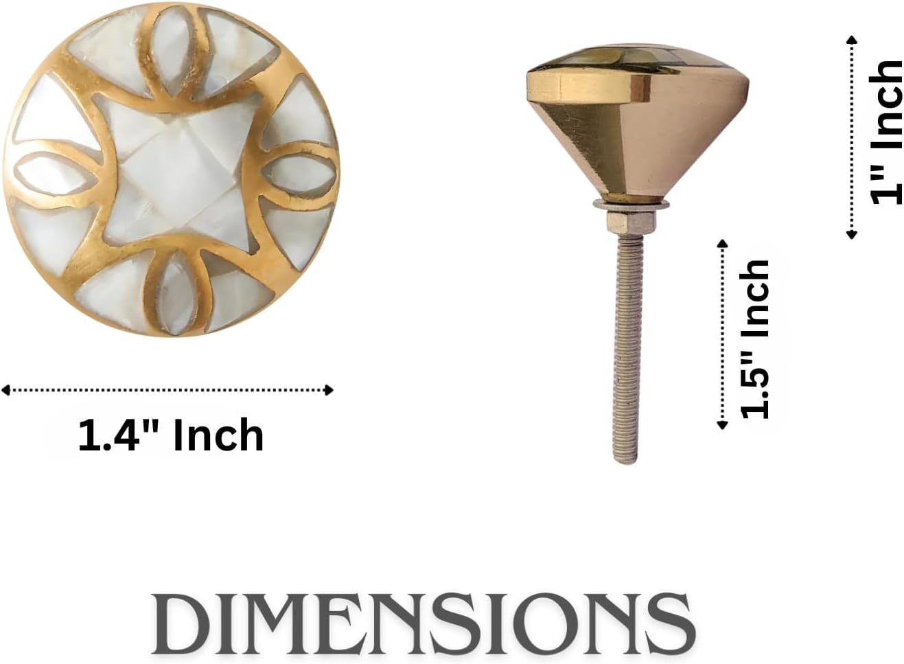 Knob Size- DIMENSIONS: Diameter: 1.41" Width: 0.98" Screw Size: 1.57" and Weight (Pkg+Style):- 200 gram These are best Quality Handmade 6 Pieces MOP Gold Brass Knobs/ Drawer Pulls We Pack in Very Safe Hand with Bubble sheet individually and then 6 knobs in a poly bag to Deliver You in Very Safe Method. The Standard Hardware We have attached With The Knobs For You to make your Work very Easy.