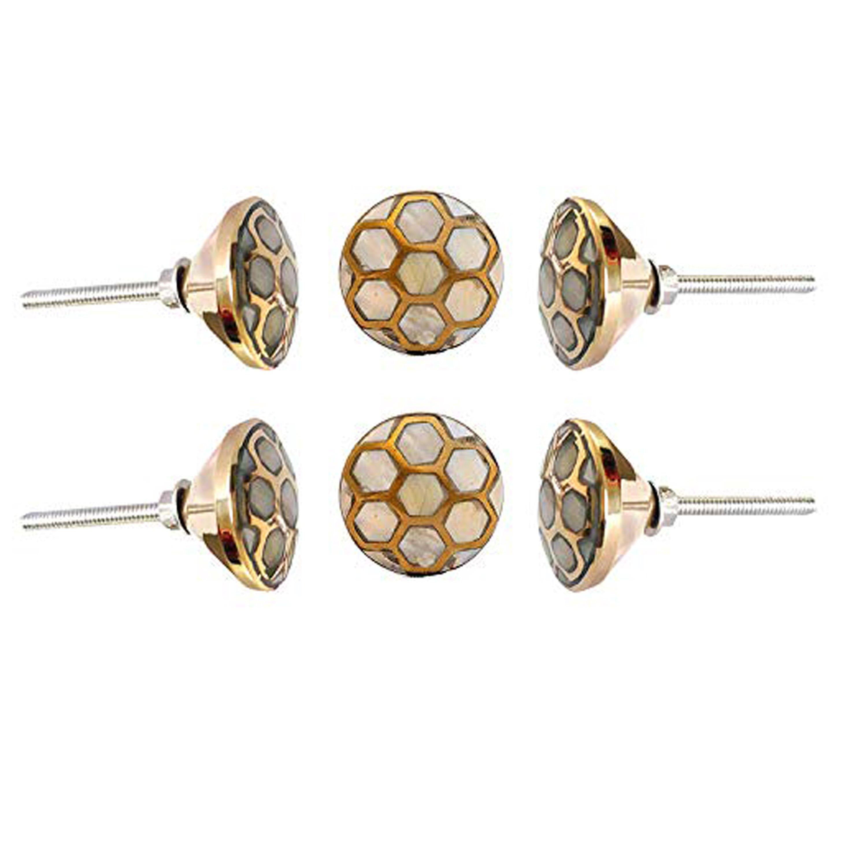 These are beautiful handcrafted set of 6 Pieces Mother Of Pearl Brass Knob . These are of Great Quality Hand made cabinet Pulls makes your Kitchen , Home Office very unique. We make our Knobs using high class raw material than other Sellers . Our quality controllers are very strict in quality control of each product. Look wise These knobs are very pretty. These Knobs always supplied with Standard Size Hardware and plastic washers .