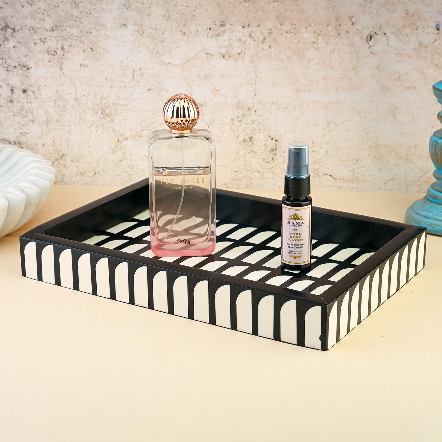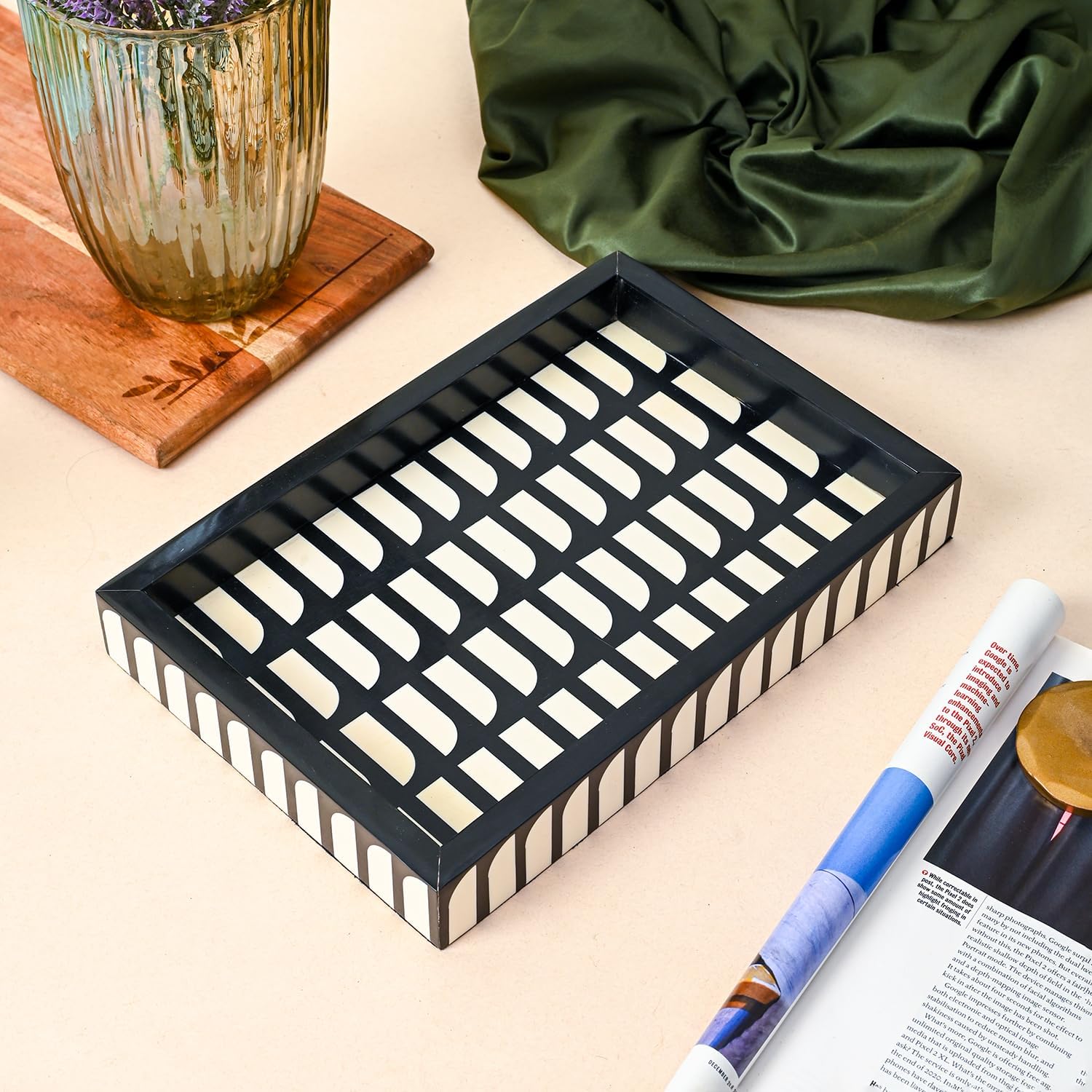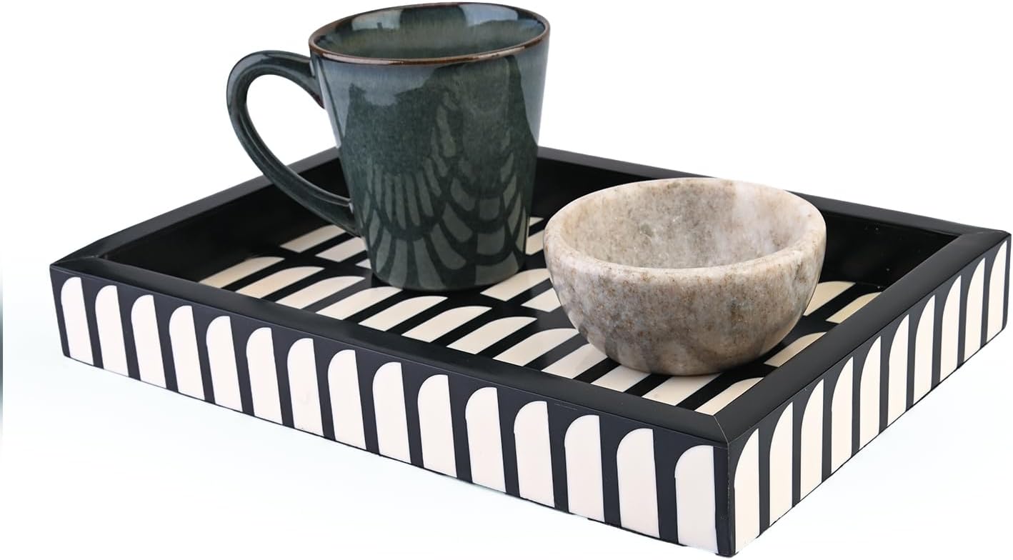 • MULTIPURPOSE : This wooden serving tray can be used as a decorative tray, an ottoman tray for living room, bathroom trays for counter, a vanity and perfume tray for Bedroom, coffee table tray, table decor, and more. Bring a decorative accent into your home with this dazzling tray.