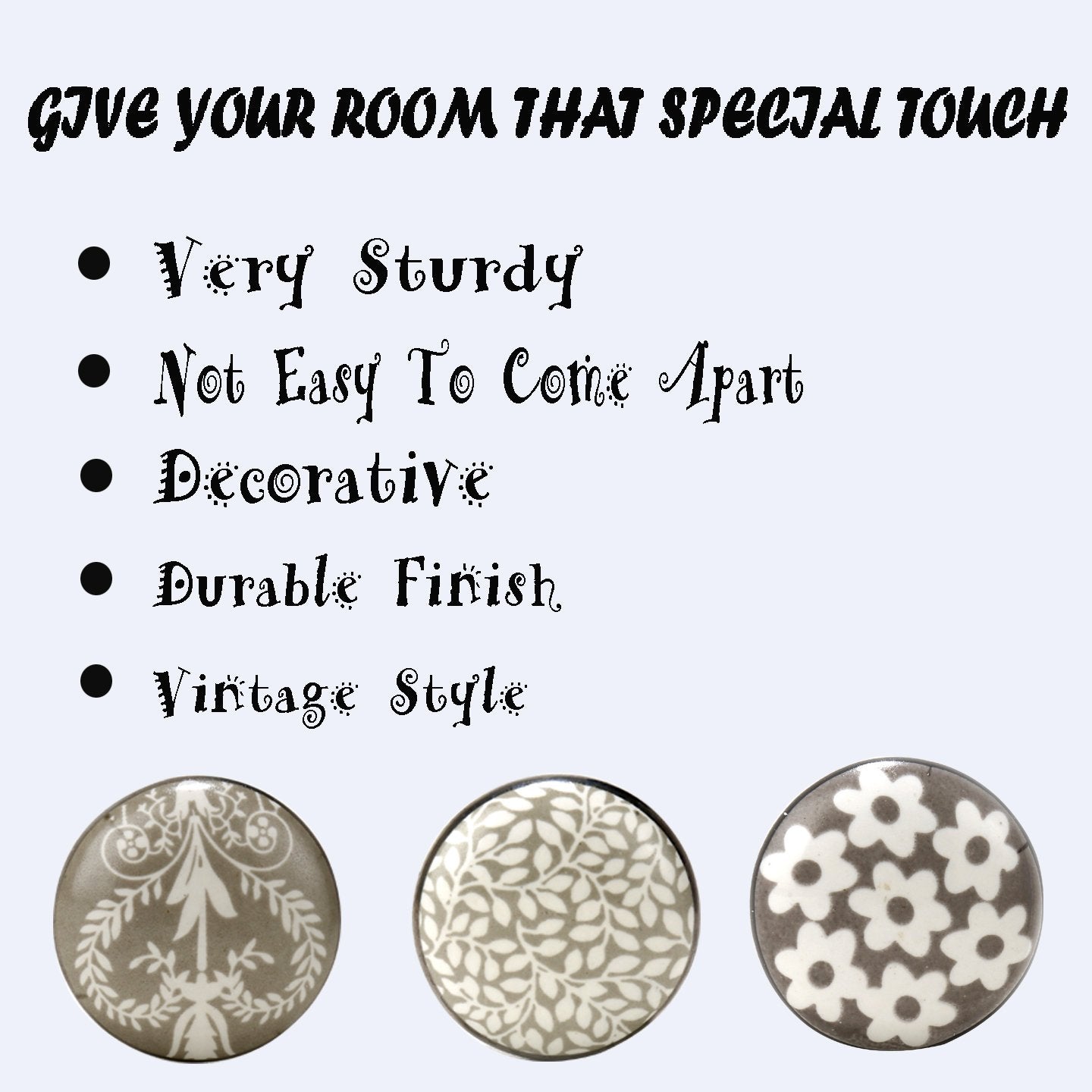 These are beautiful Handcrafted Set Of 6 Flower Design Ceramic Knobs . These are of Great Quality Hand made cabinet Pulls makes your Kitchen , Home Office very unique. We make our Knobs using high class raw material than other Sellers . Our quality controllers are very strict in quality control of each product. Look wise These knobs are very pretty. These Knobs always supplied with Standard Size Hardware and plastic washers .