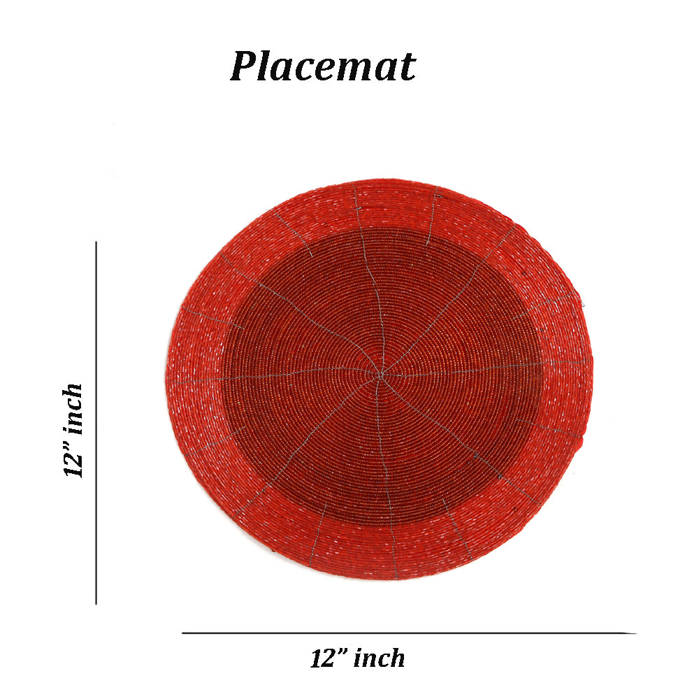 SET CONTENTS: Each set includes 2 placemats and 4 Coasters Round Beaded Coasters in Golden , each measuring 4 inches round Placemat 12 inch round
