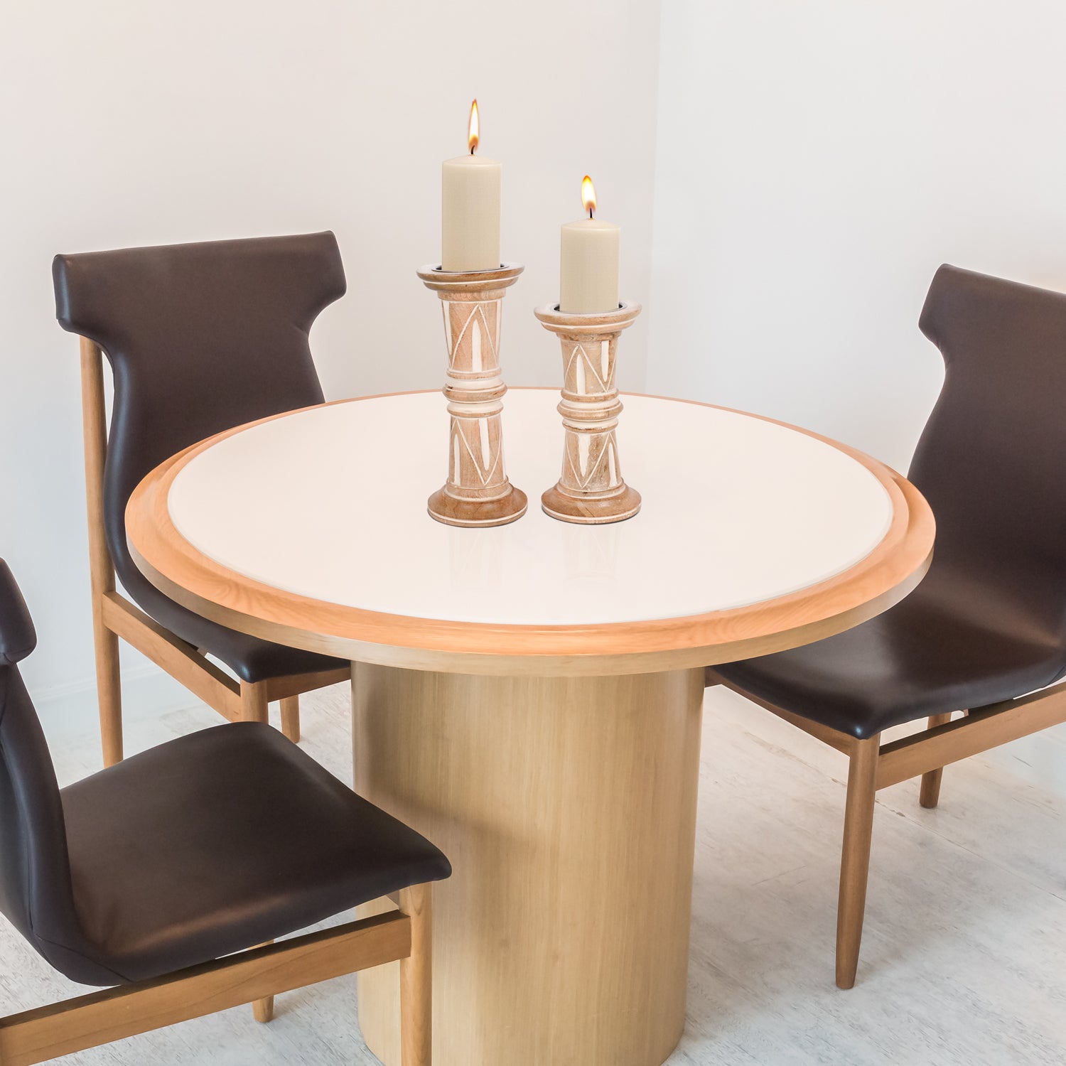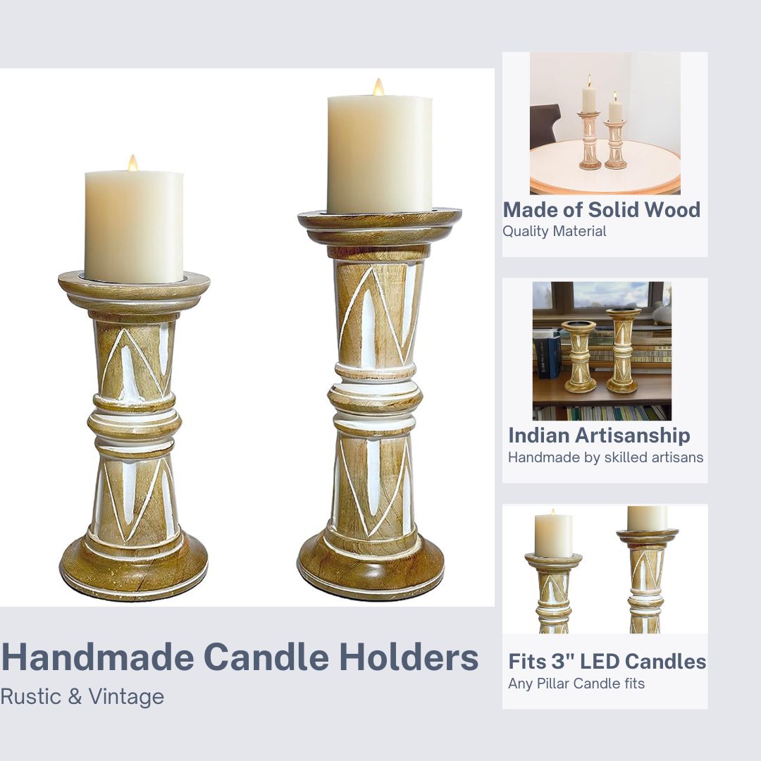 Brighten up any room with this beautifully crafted set of 2 wooden candle holders. Made of mango wood, each holder is handmade for a unique, one-of-a-kind finish. Perfect for adding a touch of rustic style and natural warmth to any living space.