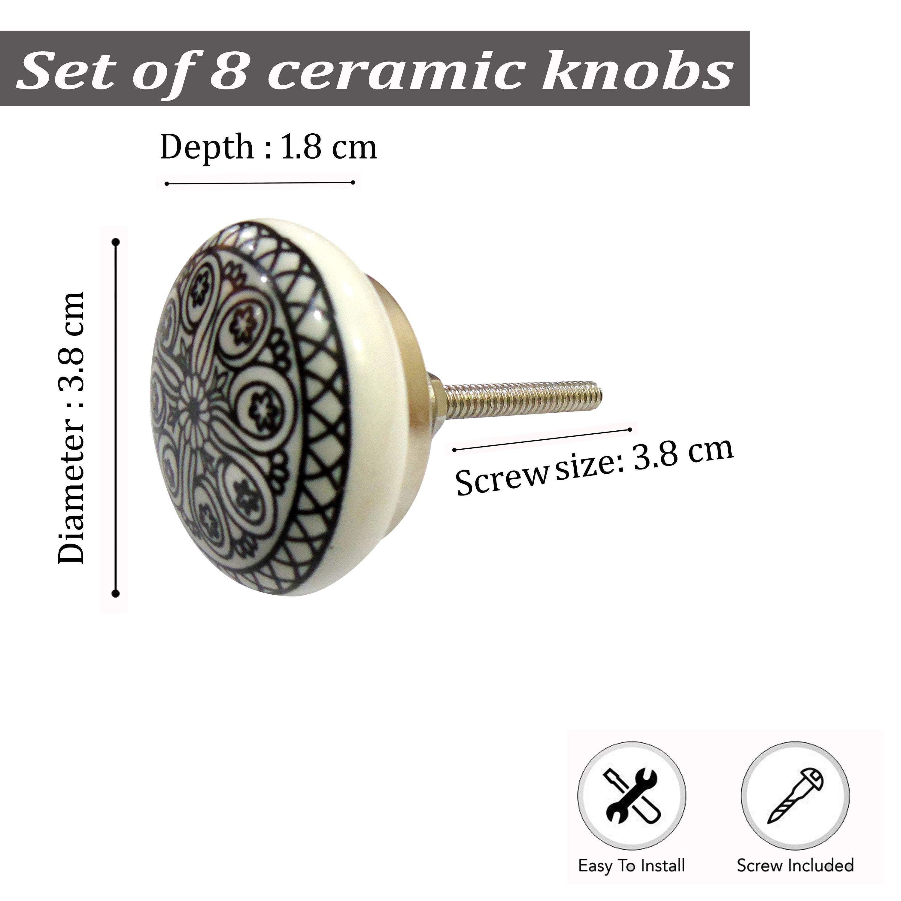Knob Size- Diameter 3.8 x Depth 2.2 x Screw Size 3.8 cm & Weight 320 grams These are best Quality Handmade 8 Pieces Ceramic Knobs/ Drawer Pulls We Pack in Very Safe Hand with Bubble sheet individually and then 8 knobs in a poly bag to Deliver You in Very Safe Method. The Standard Hardware We have attached With The Knobs For You to make your Work very Easy.