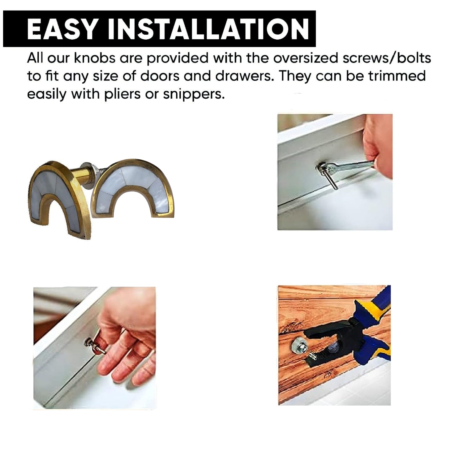 These are beautiful handcrafted set of 6 Pieces Mother of pearls Brass Knob. These are of Great Quality Hand made cabinet Pulls makes your Kitchen , Home Office very unique. We make our Knobs using high class raw material than other Sellers . Our quality controllers are very strict in quality control of each product. Look wise These knobs are very pretty. These Knobs always supplied with Standard Size Hardware and plastic washers .