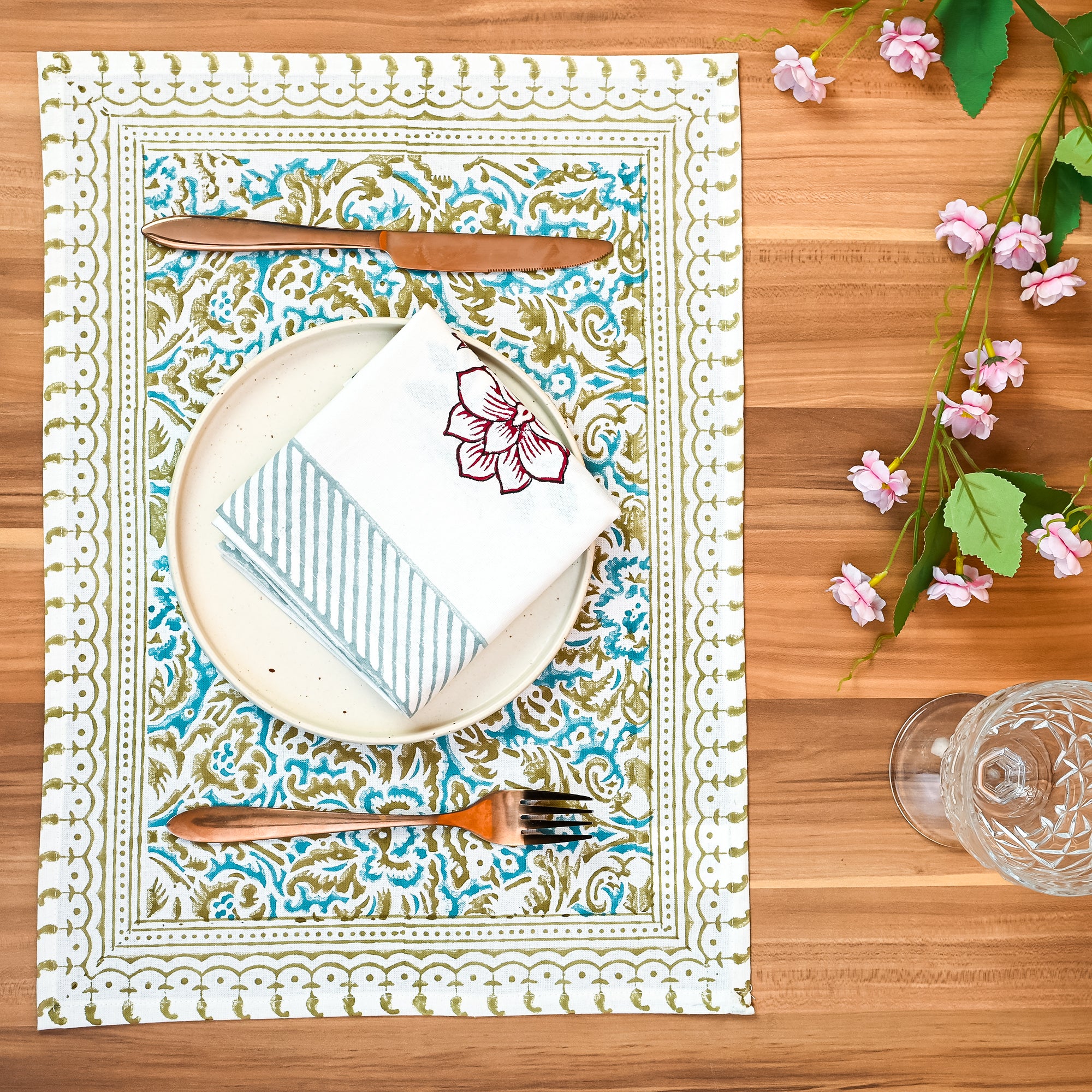 HAND BLOCK PRINTED ARTISAN CRAFTSMANSHIP – Perilla Home multicolor cotton TableMatfeatures intricate floral designs inspired by French Provencal and traditional Indian art. Each piece is hand-printed using carved wooden blocks, making every TableMata one-of-a-kind creation.