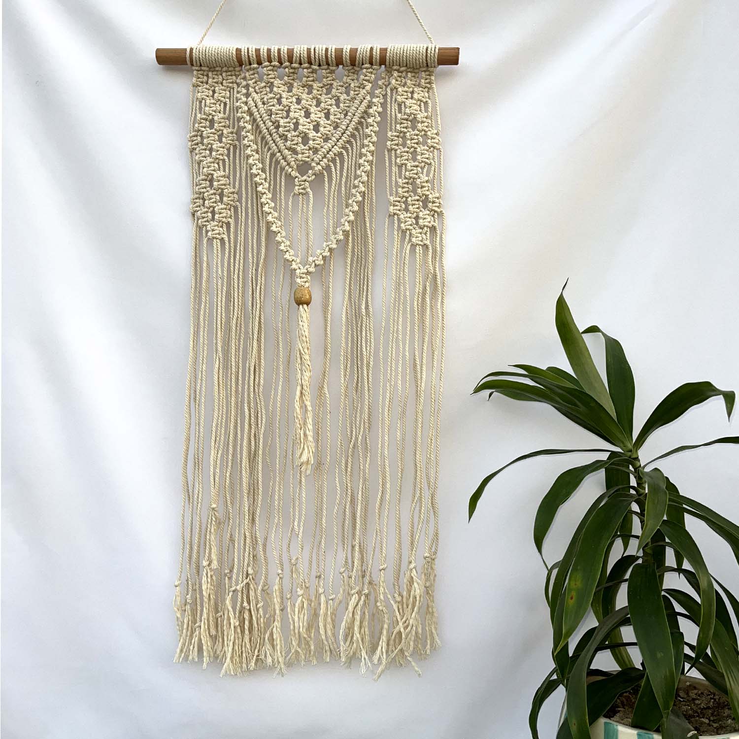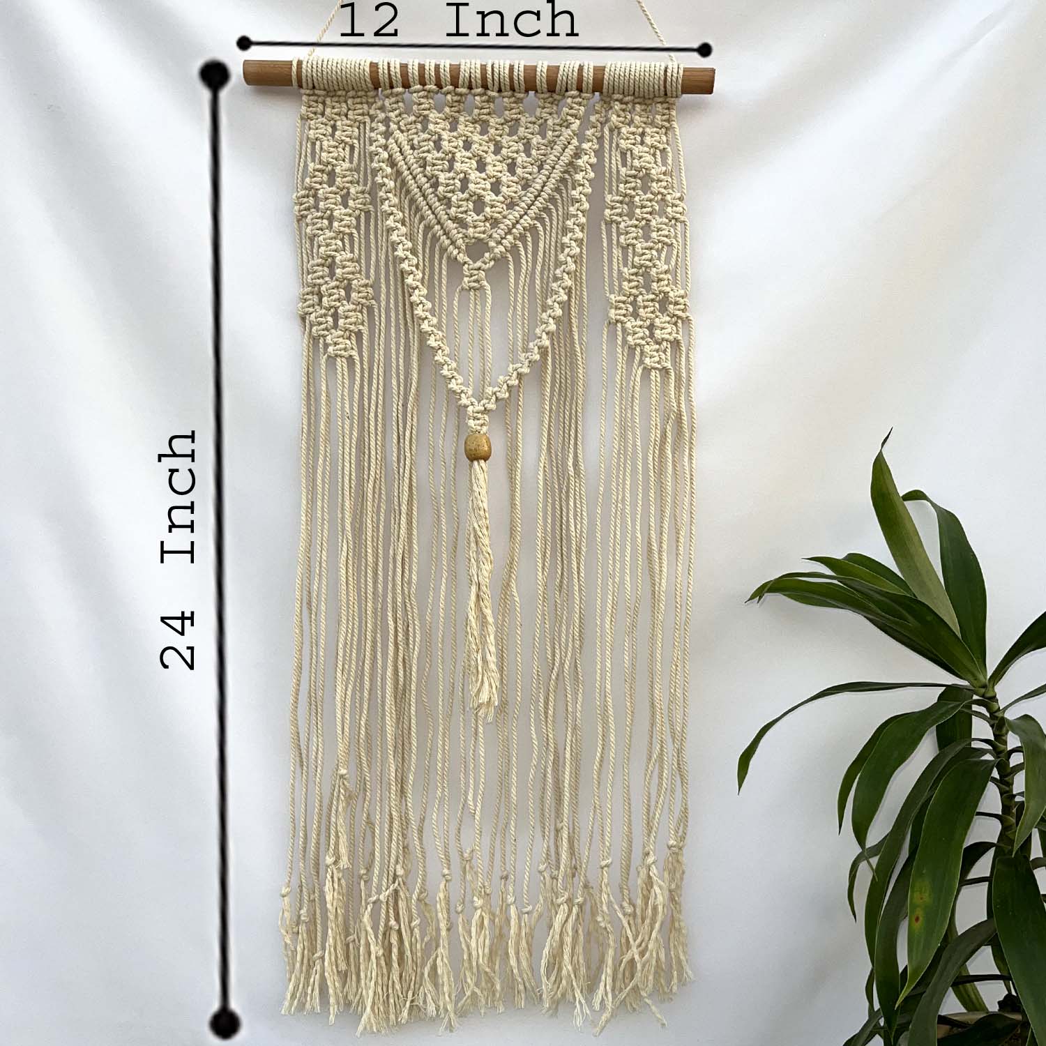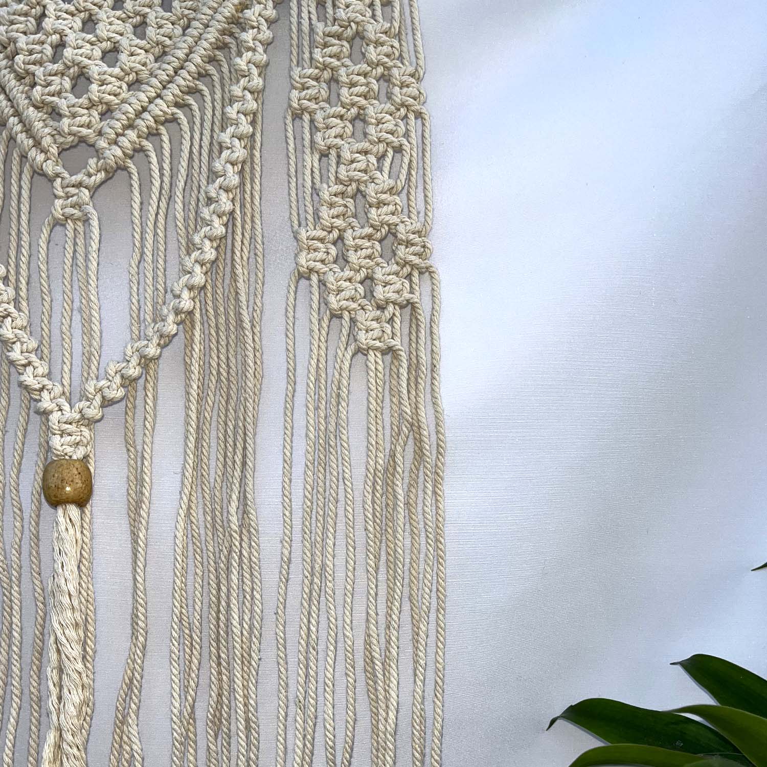 This boho macrame wall hanging adds a touch of whimsical elegance to any space. Handcrafted with natural cotton rope, it features intricate knotting and tassels, creating a beautiful texture and bohemian vibe. Perfect for a bedroom, living room, or nursery, it is a statement piece that will elevate your decor.